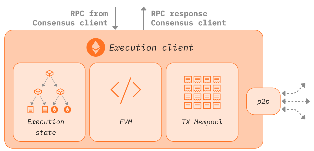 - Execution layer passes validation data back to consensus layer, block now considered to be validated (local RPC connection)